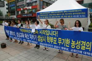 | 성남시 학부모들이 이재명 시장의 11일간 단식에도 중앙정부의 재정개악 시도는 끝나지 않았다며 천막 농성과 거리홍보를 통해 직접 나서서 지방지치와 교육주권을 지켜나가겠다고 선언했다. 성남교육지키기 학부모, 교육단체 대책위원회는 20일 오후 2시 야탑역 광장 천막농성장 앞에서 기자회견을 열고 "중앙정부가 지방세법 시행령을 철회하고 원상회복이 될 때까지 천막농성과 시민홍보전을 무기한 전개하겠다"고 밝혔다. 이어 "정부에 성남시 예산 1051억 원을 빼앗기게 되면 성남시 가용예산 2600억 원의 약 40%가 삭감되는 것이며, 교육예산 700억도 일반무상급식 등 시장의 법적 의무배정 약 300억 원을 제외하면 성남시 교육자체예산 400억 원 이상이 중단 내지 대폭 삭감될 수밖에 없는 중대한 위기를 맞게 된다"고 주장했다. 또한 "성남시는 독자적인 예산으로 전국 최초로 친환경 우수농산물(유기농) 급식비를 8만 7940명의 유,초,중학생에게 지원(54억 원)하고 있으며, 8900여 명에게 무상교복비 15만 원 지원(25억 원), 학교환경 개선사업 지원(90억 원)을 비롯 대학생 학자금 이자지원, 외국어 체험학습비 지원, 학교밖 청소년 지원 등을 시행하고 있는데 시행령 개정으로 전면 중단 및 대폭 축소가 불가피하다"고 강조했다. 이날 기자회견에는 학부모들의 규탄 발언과 호소도 이어졌다. 상대원초등학교 학부모라고 소개한 장 모씨는 "(정부의 재정개악으로) 우리 아이들의 교육 혜택이 줄어들고, 아이들이 피해를 받을 수밖에 없기 때문에 반대하고 있다"며 "많은 시민들과 학부모들이 더 많은 관심을 가져주길 바란다"고 당부했다. 이어 돌마고등학교 박경희 학부모회장은 "정부의 지방세법 시행령은 그 어떤 도시보다 많은 지원을 하고 있는 성남시의 재정을 빼앗는 것"이라며 "성남시민의 약 30-40%가 교육과 관련이 있는 시민들이다. 우리 시민들이 앞정서야 막을 수 있다"면서 시민들의 동참을 호소했다. 대책위 이석주 집행위원장은 "학부모들은 천막농성보다 더 힘든 일도 마다하지 않을 만큼 분노하고 있다"며 "시민들에게 매일 홍보하는 것과 더불어 성남시민사회단체들에게도 제안해서 힘을 모아나가겠다"고 밝혔다.